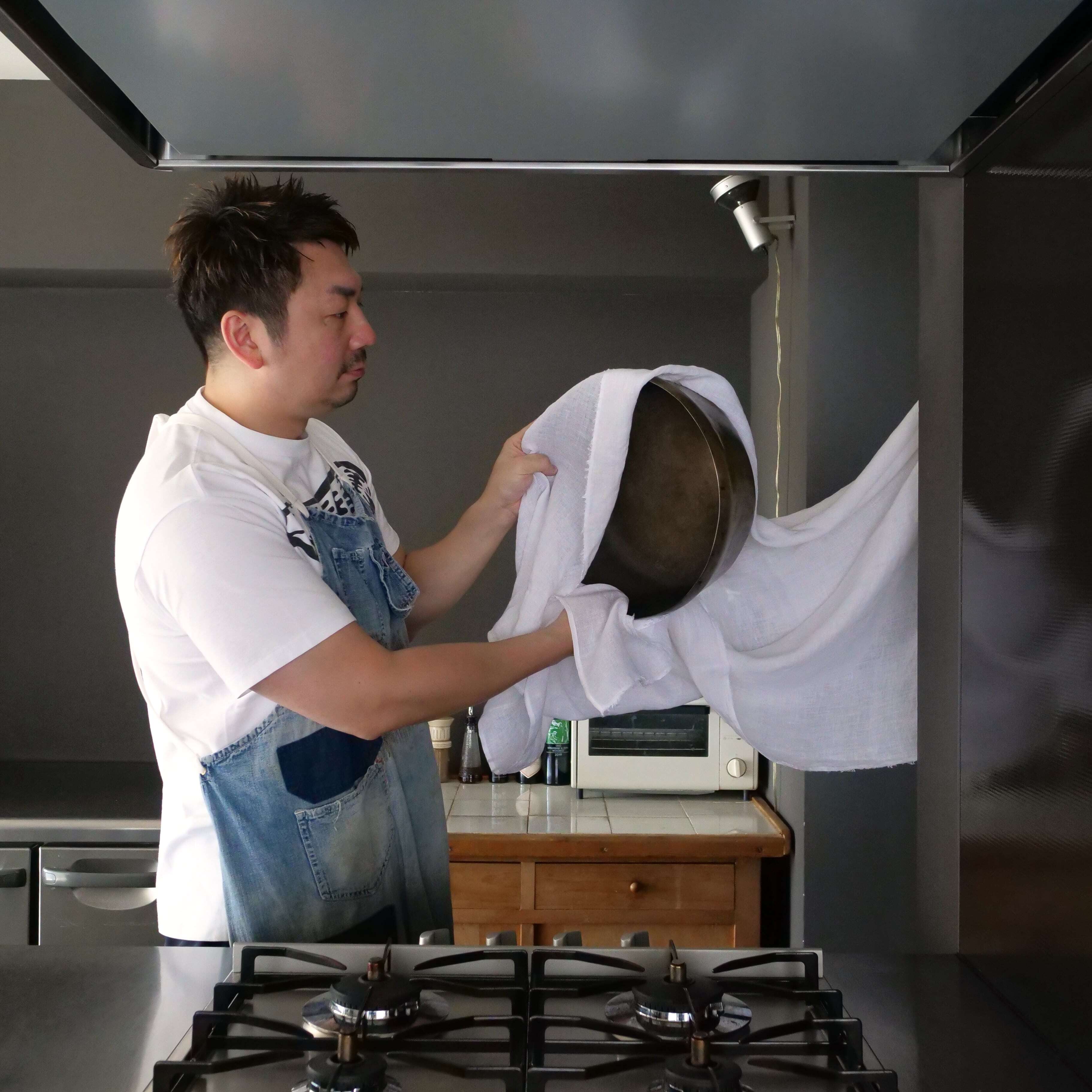 ちょっとその辺にかけておけばすぐに乾いて、また次の鍋を拭いて…と、本当に手放せないものです。出張の料理教室の時に、持っていくことすらあります。