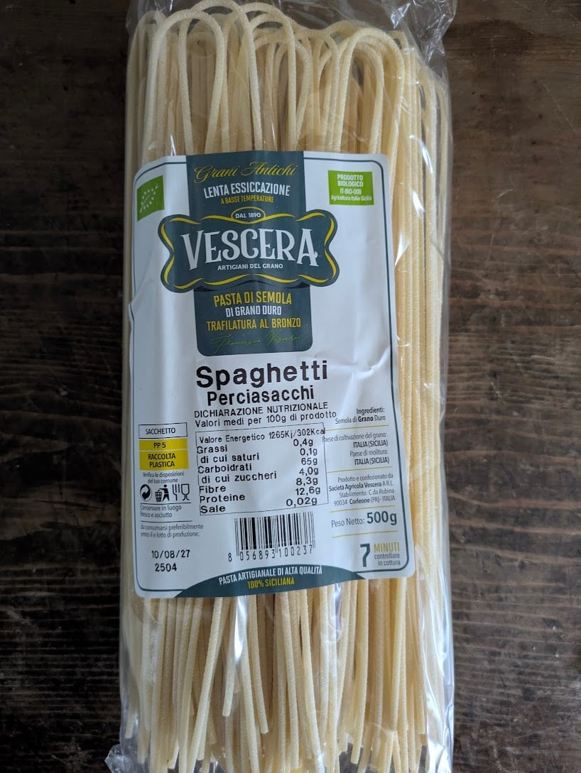 シチリア州コルレオーネに工房を構えるVescora社が製造するシチリア産古代硬質小麦Perciasacchi(ペルチャサッキ種)パスタ。 香り豊かな古代小麦の栄養素を保つ低温、長時間乾燥された職人パスタ。