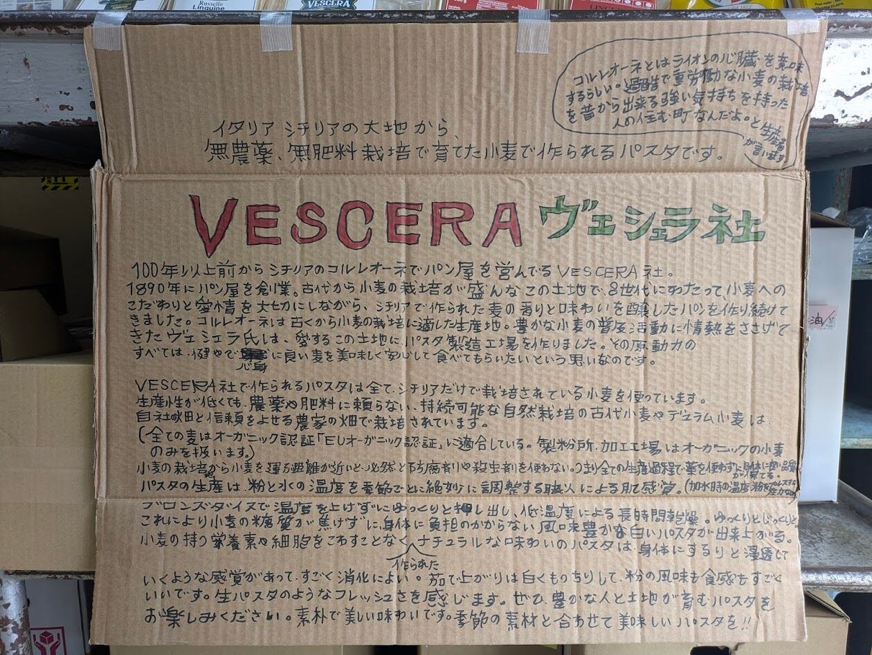 現在では品種改良された現代小麦の普及によるグルテン関連疾患と関係する健康問題に早くから意識し、風味が豊かでミネラルや食物繊維、抗酸化物質を多く含み消化がしやすく、生産性は低めだが農薬や肥料に頼らない持続可能な自然栽培が可能なシチリアの古代小麦を使用したパスタを生産し、自社畑もしくは信頼を寄せる契約農家が小麦を製粉する製粉所はオーガニックの小麦のみ扱う。この事も非常に重要とヴェシェラ氏は考える。パスタや小麦粉はEUの厳格なオーガニック基準をみたすユーロリーフ(EUオーガニック認証)に適合している製品を生産している。パスタ生産は粉と水の温度を季節ごと絶妙に調整する職人による肌感覚。ブロンズダイスで温度を上げずにゆっくりと押し出し、乾燥は低温長時間。これにより小麦の糖質が焦げず体に負担をかけず、風味が豊かな白いパスタが出来上がる。