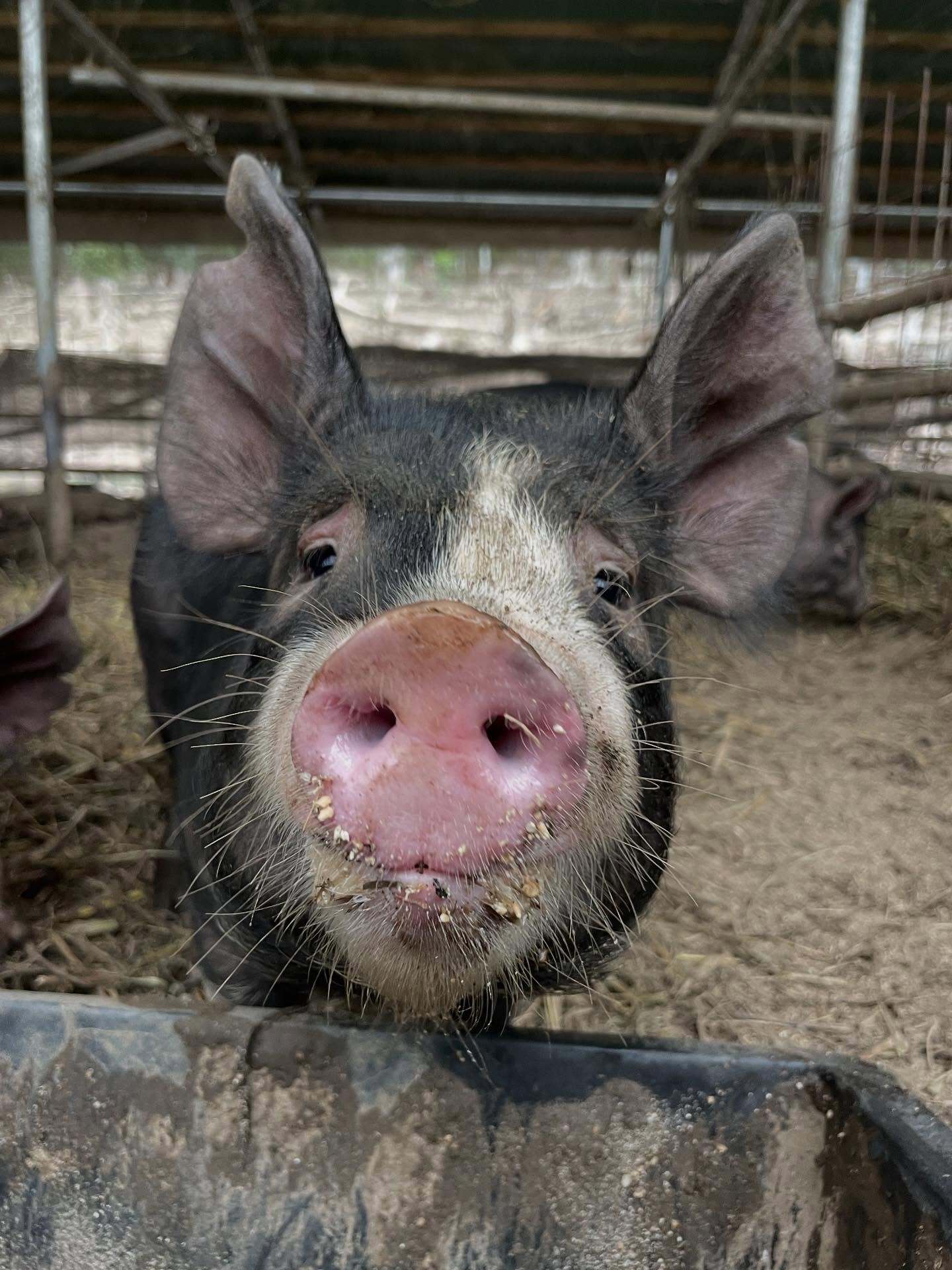 いつも豚肉を扱ってくださる販売店、飲食店、食べてくださる皆様ありがとうございま す。今月は黒豚3頭の出荷でした。昨年4月に3ヶ月齢で導入した雌3頭です。月齢は 約13ヶ月。出荷時生体重 (屠殺する前の重さ)は1頭あたり約80kgとだいぶ小さ めの個体たちでした。いつもの穀物飼料(麦米大豆)は変わらず、緑餌は青草サイレー ジと今年農園でたくさん収穫できた人参の皮、隣町でワイン醸造をしている亀が森醸造 所さんから葡萄の搾り粕をいただき与えました。