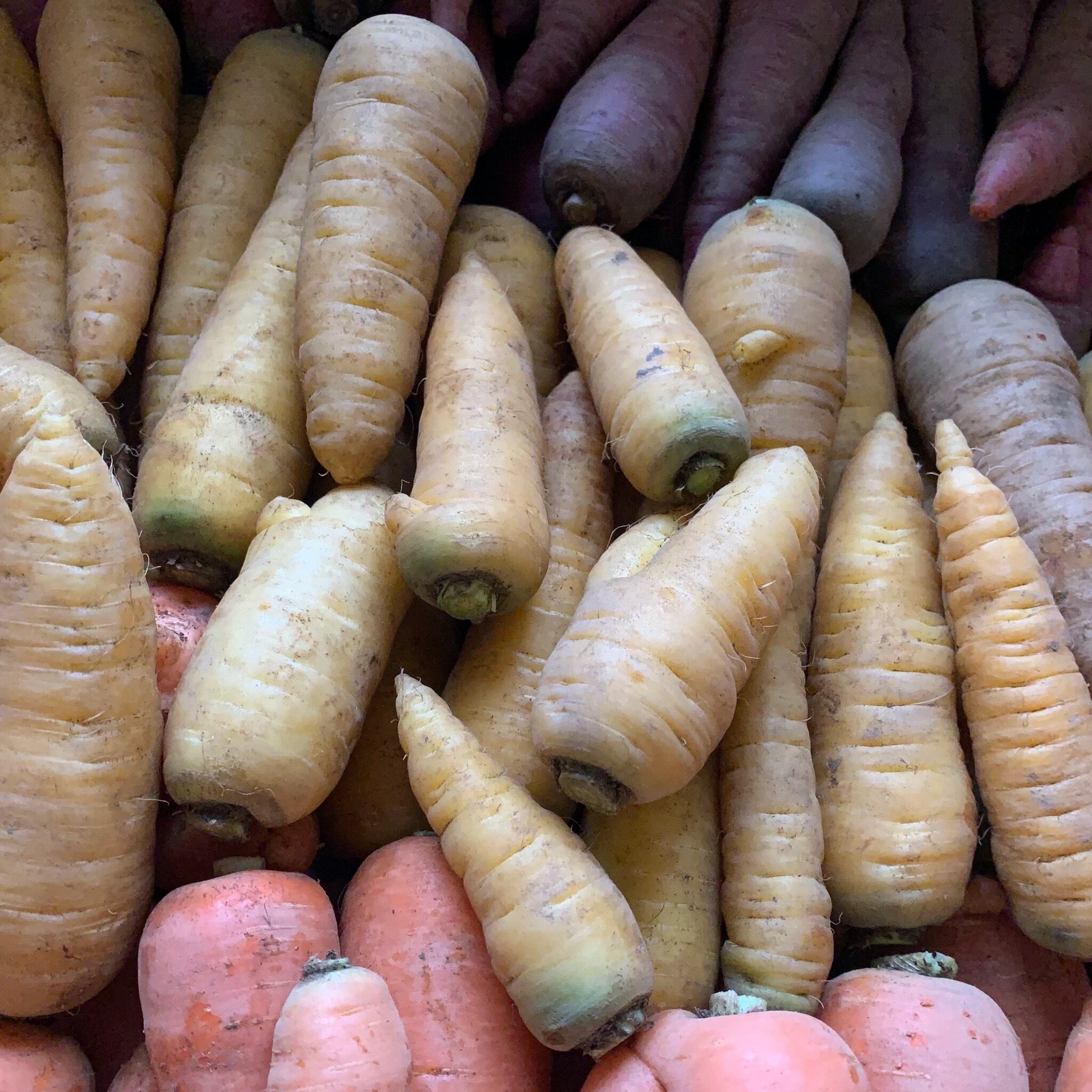 紫(コズミックパープル)・黄(ソーラーイエロー)・オレンジ(黒田五寸)の3色です。すべての品種自家採種です。火入れも生もどちらでも絶品です!
